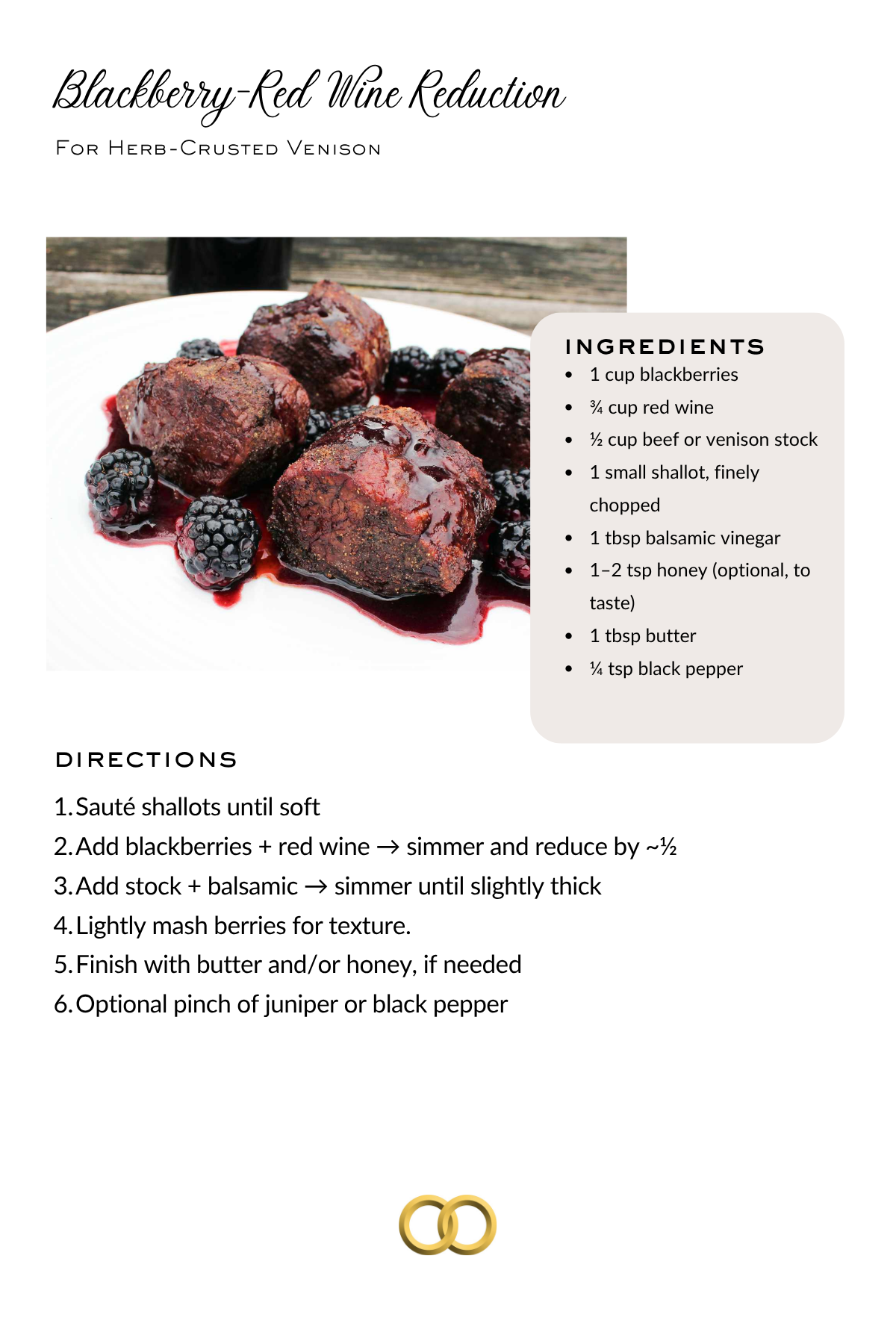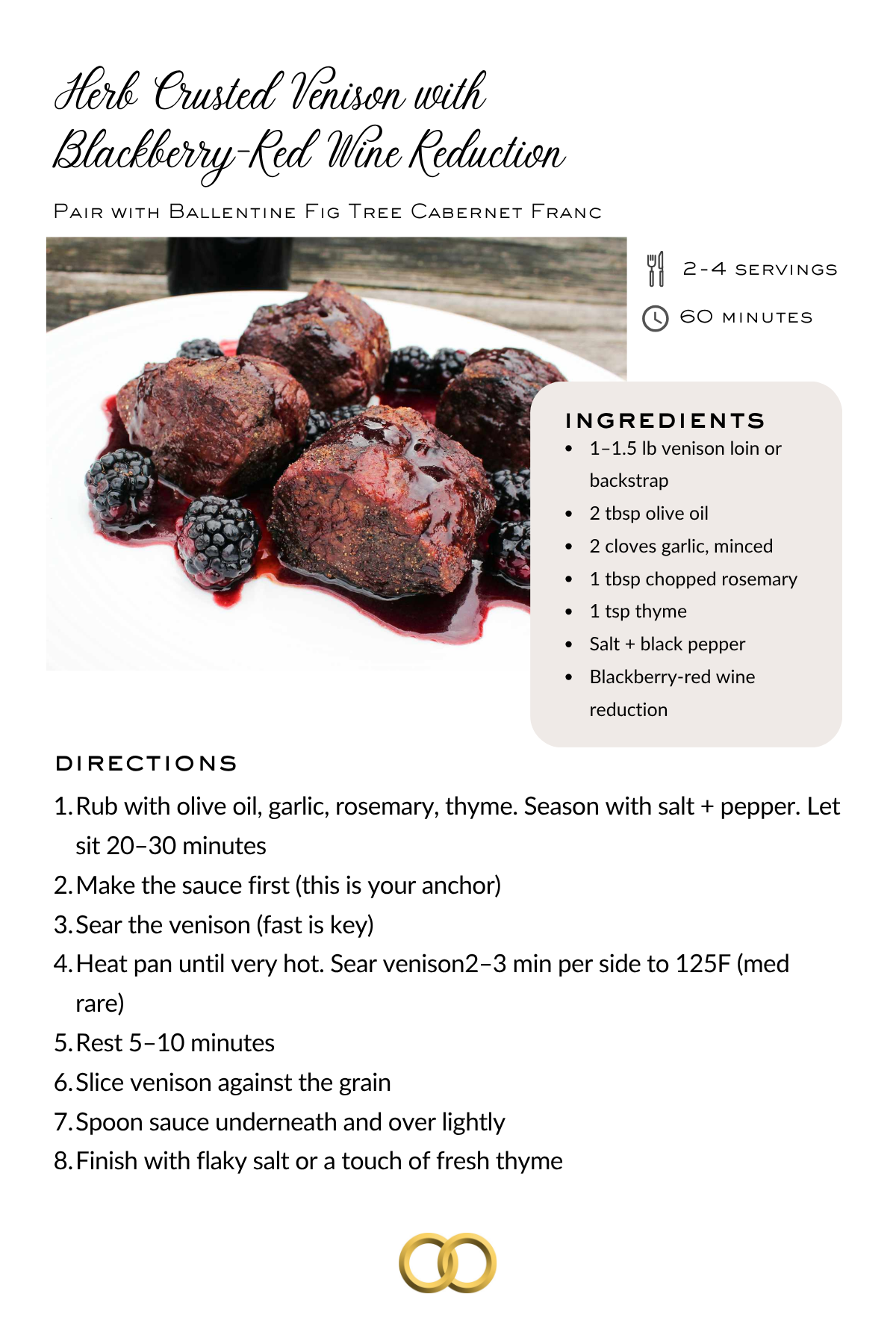 Cab Franc makes a perfect pairing for the flavors in this venison entree. Be sure to download the recipe for the matching Blackberry-Red Wine Reduction Sauce.